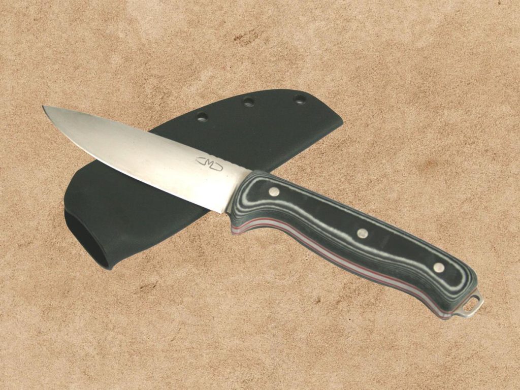 Handliches Messer zum Angeln mit einem Griff aus schwarz-weißem Micarta mit einem roten Leiner.