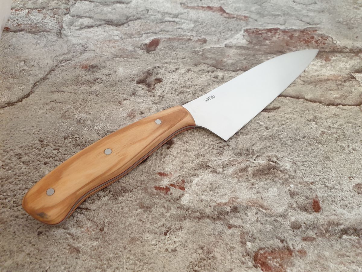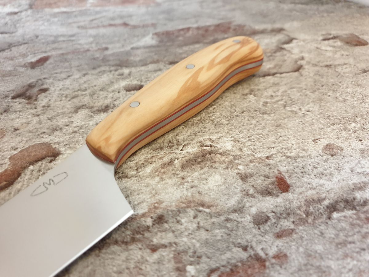 Das perfekte Messer für die täglichen Arbeiten in der Küche. Es eignet sich hervoragend zu schneiden von Fleisch, Zwiebeln, Paprika und sonstigem Gemüse. Als Stahl wurde hier der N690 von Böhler verwendet und der Holzgriff ist aus Olivenholz mit einem roten Liner aus Vulkanfiber.