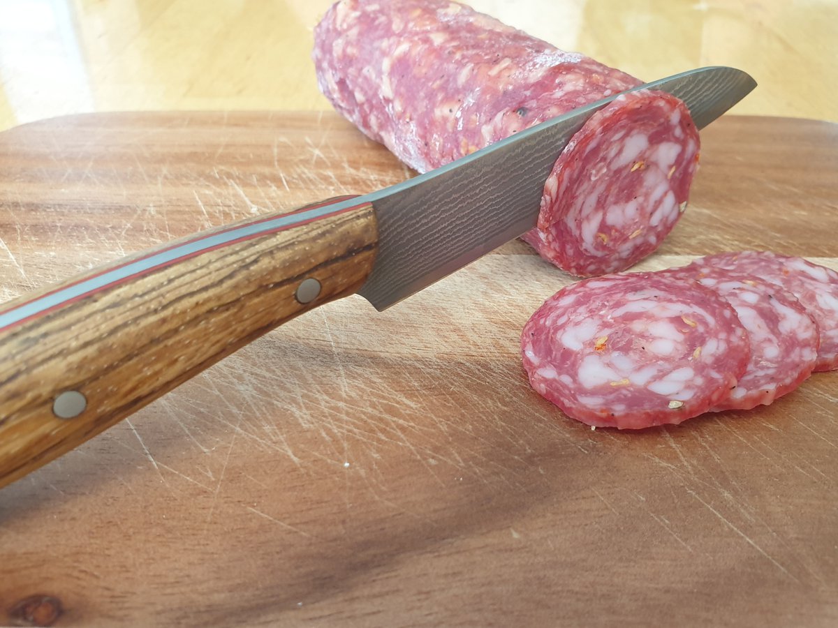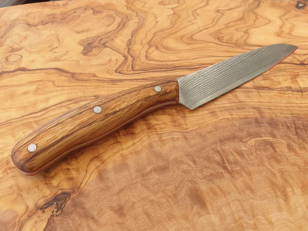 Ein kleines Küchenmesser für verschiedene kleinere Arbeiten in der Küche. Als Stahl wurde hier VG10 Laminatstahl verwendet, bei dem nach dem Ätzen ein schönes Muster hervortritt. Der Holzgriff ist aus Zebrano und wurde noch zusätzlich mit einem roten Liner aus Vulkanfiber verziert.