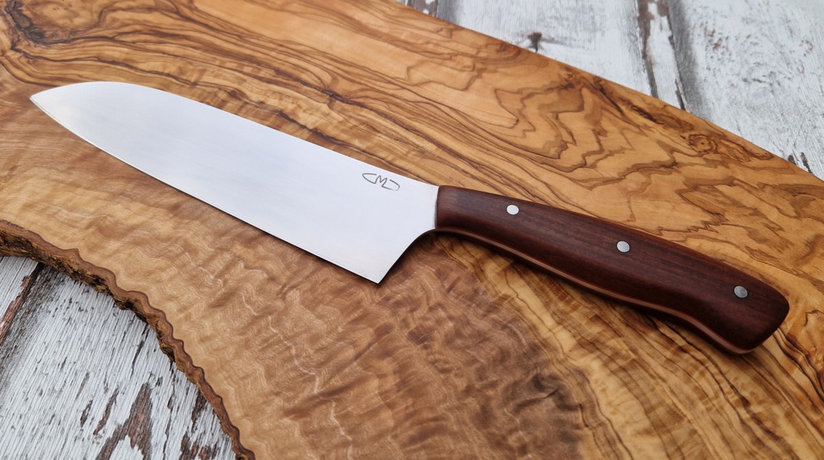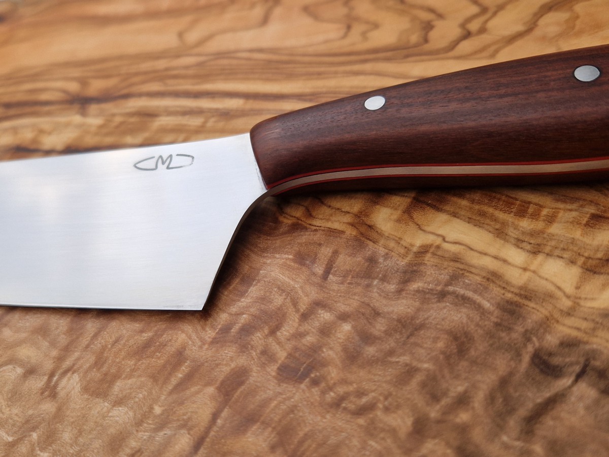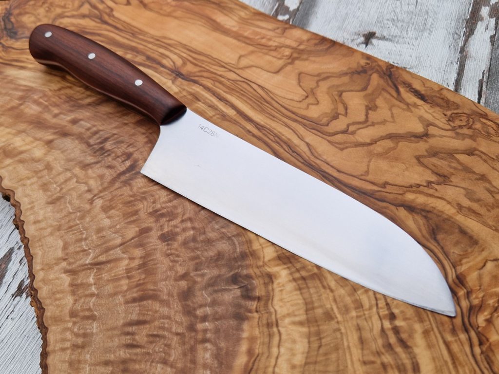 Das Santoku ist ein Messer, welches traditionell für Fleisch, Fisch und Gemüse verwendet wird. Durch die breite Klinge kann man das Schnittgut sehr gut aufnehmen und in den Topf geben. Das Messer wurde aus dem Skandinavischen Stahl 14C28N hergestellt, der speziell für Messer entwickelt wurde. Der Holzgriff ist aus Santos Morado und wurde noch zusätzlich mit einem roten Liner aus Vulkanfiber verziert. Wie man an dem letzten Bild erkennen kann, hat das Messer auch einen kleinen Bruder.
