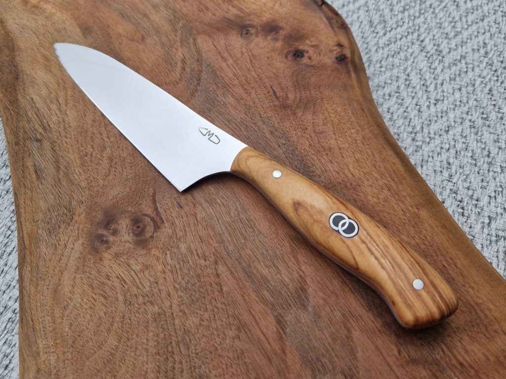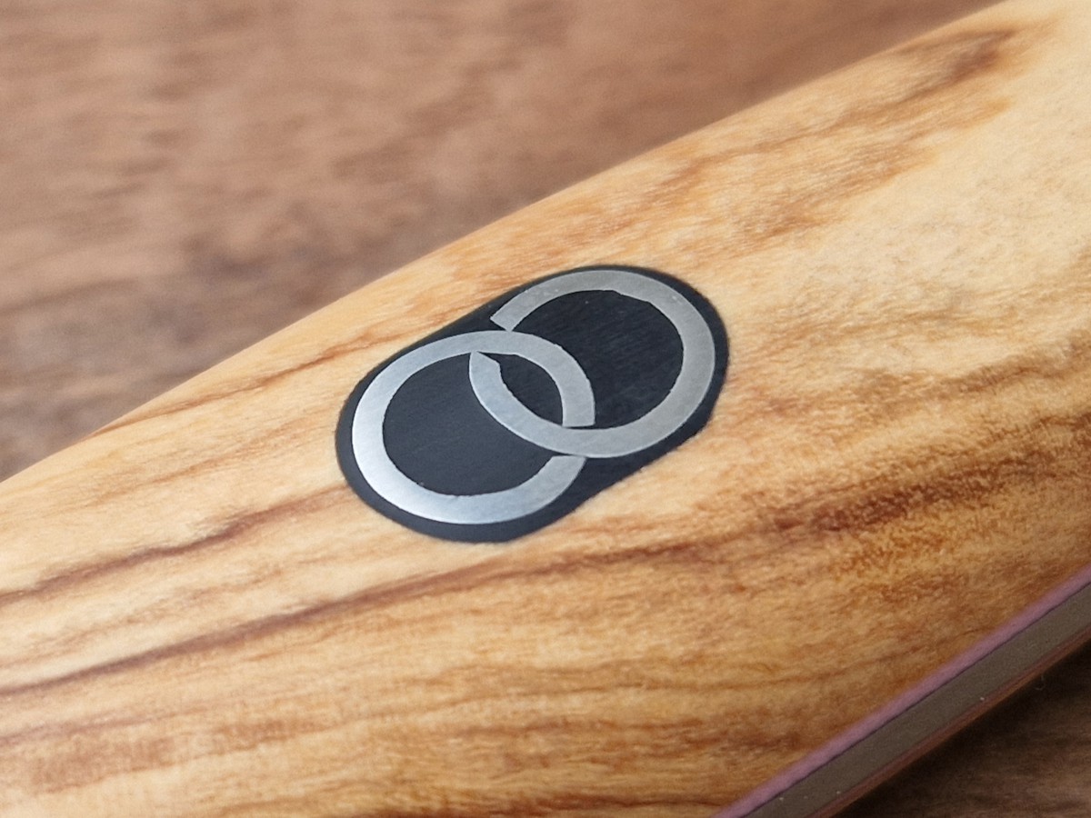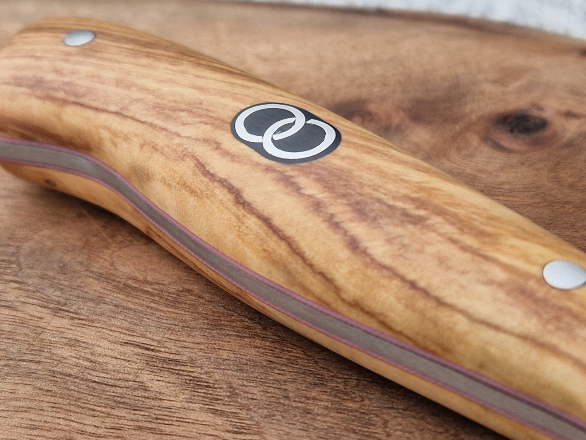 Hier ist ein ganz besonderes Messer zu sehen. Es wurde speziell als Hochzeitsgeschenk designed. Da die Frau sehr gerne rosa mag, wurde ein rosa Liner aus G10 zwischen dem Olivenholz und dem Erl eingefügt. Als besonderes Extra wurden anstelle der mittleren Niete zwei ineinander geschobene Edelstahlrohre als Symbol für die Hochzeitsringe integriert. Die Ringe wurden mit schwarzem Epoxydharz ausgegossen und fein geschliffen. Das Messer wurde aus dem Böhler N690 Stahl hergestellt.