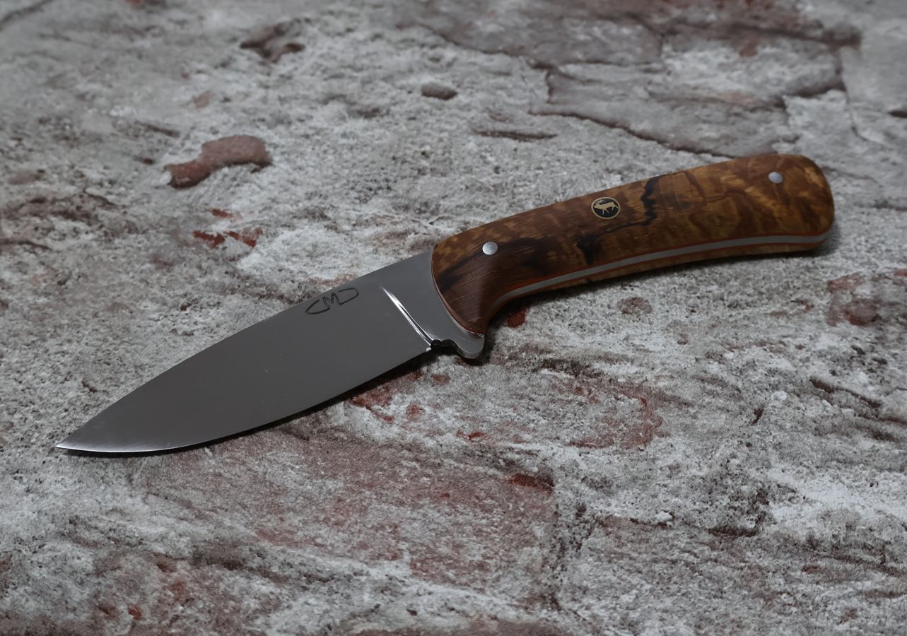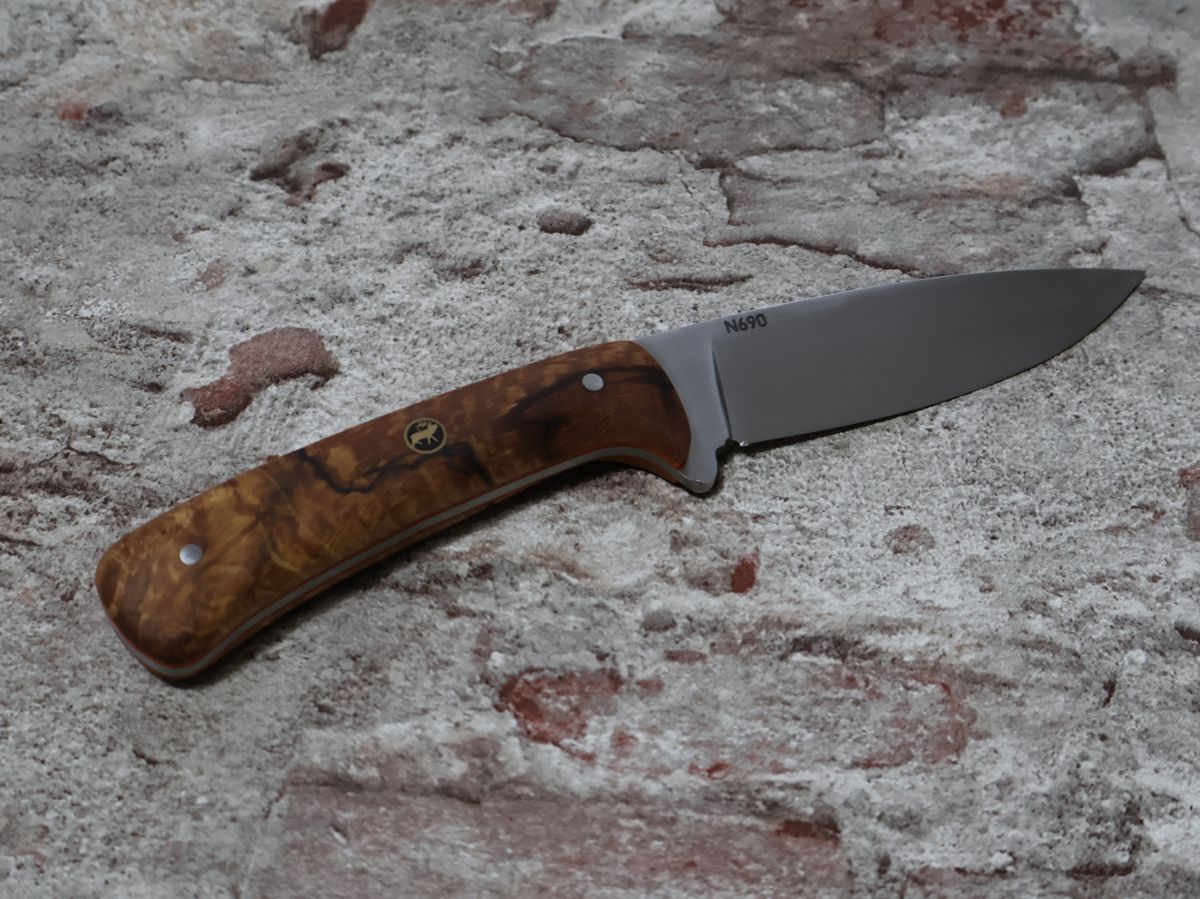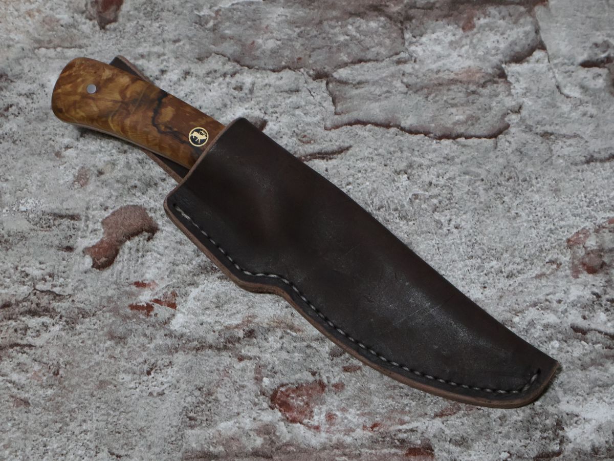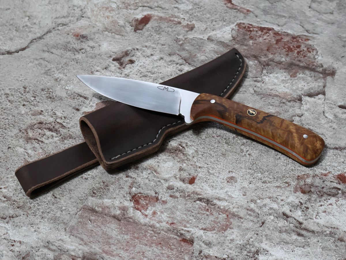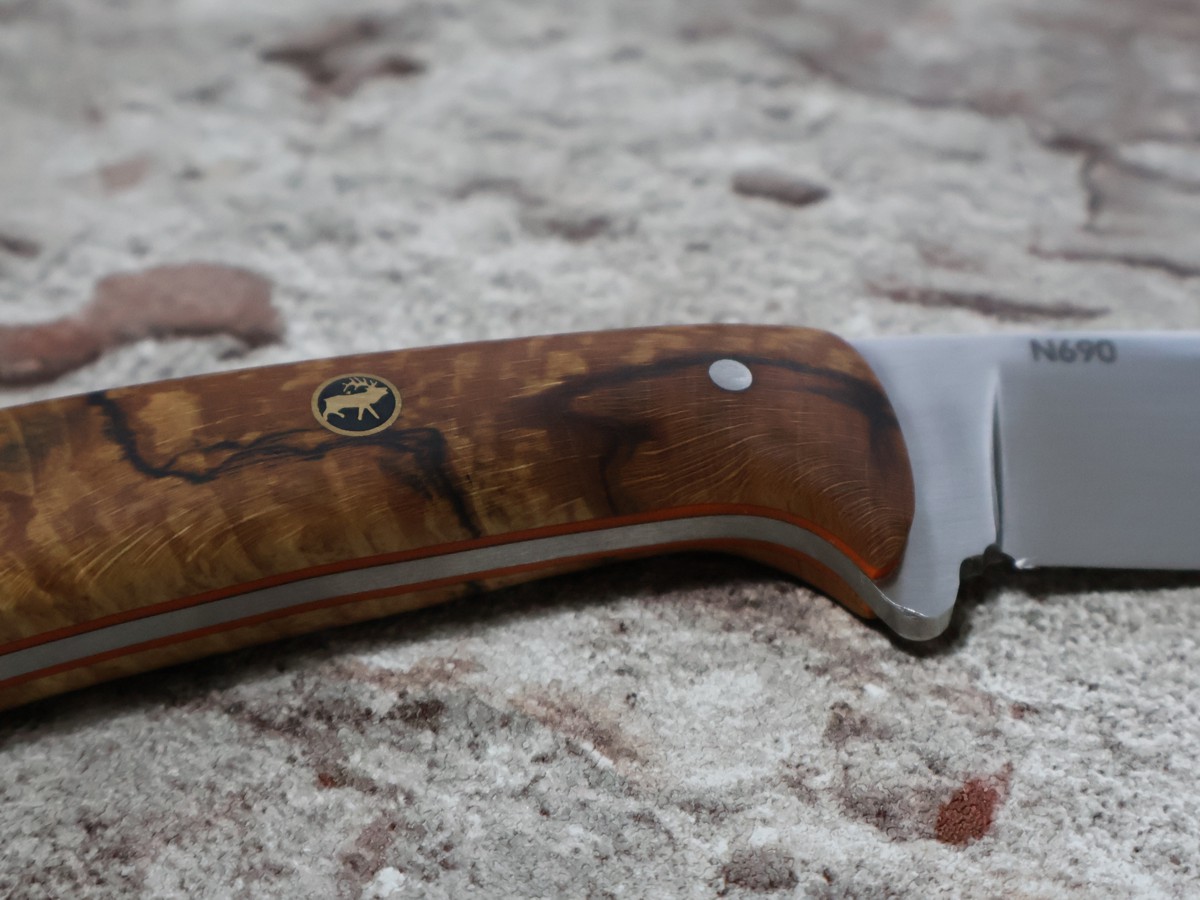 Hier siehst du ein edles Jagdmesser mit einem Mosaikpin mit Hirschmotiv. Der Griff aus stabilisierter gestockter Buche ist mit einem zusätzlichem orangen Liner aus G10. Als Stahl wurde der Böhler N690 in 3,5mm stärke verwendet. Die Lederscheide ist aus braunem Rindsleder und auf das Messer angepasst.