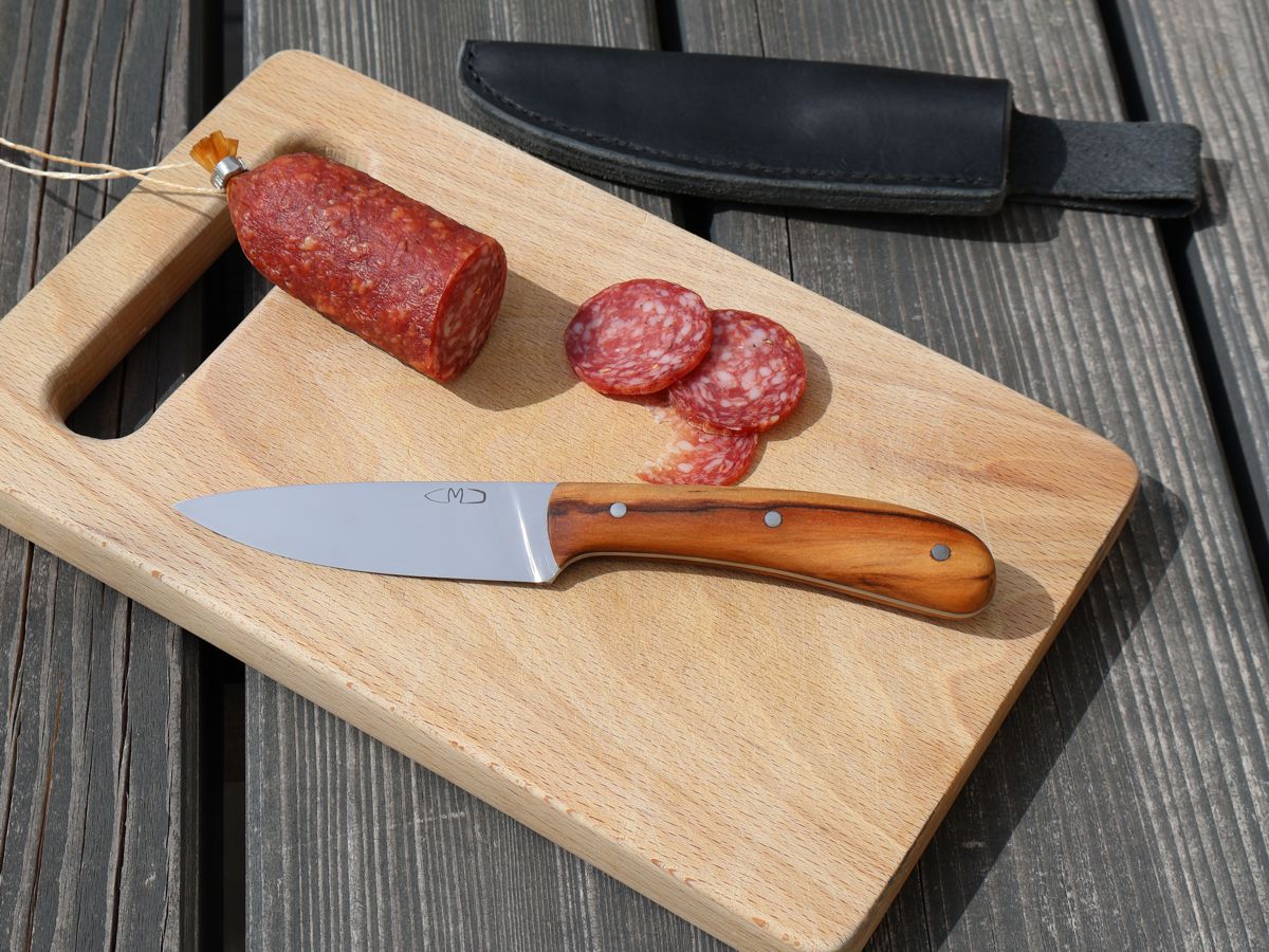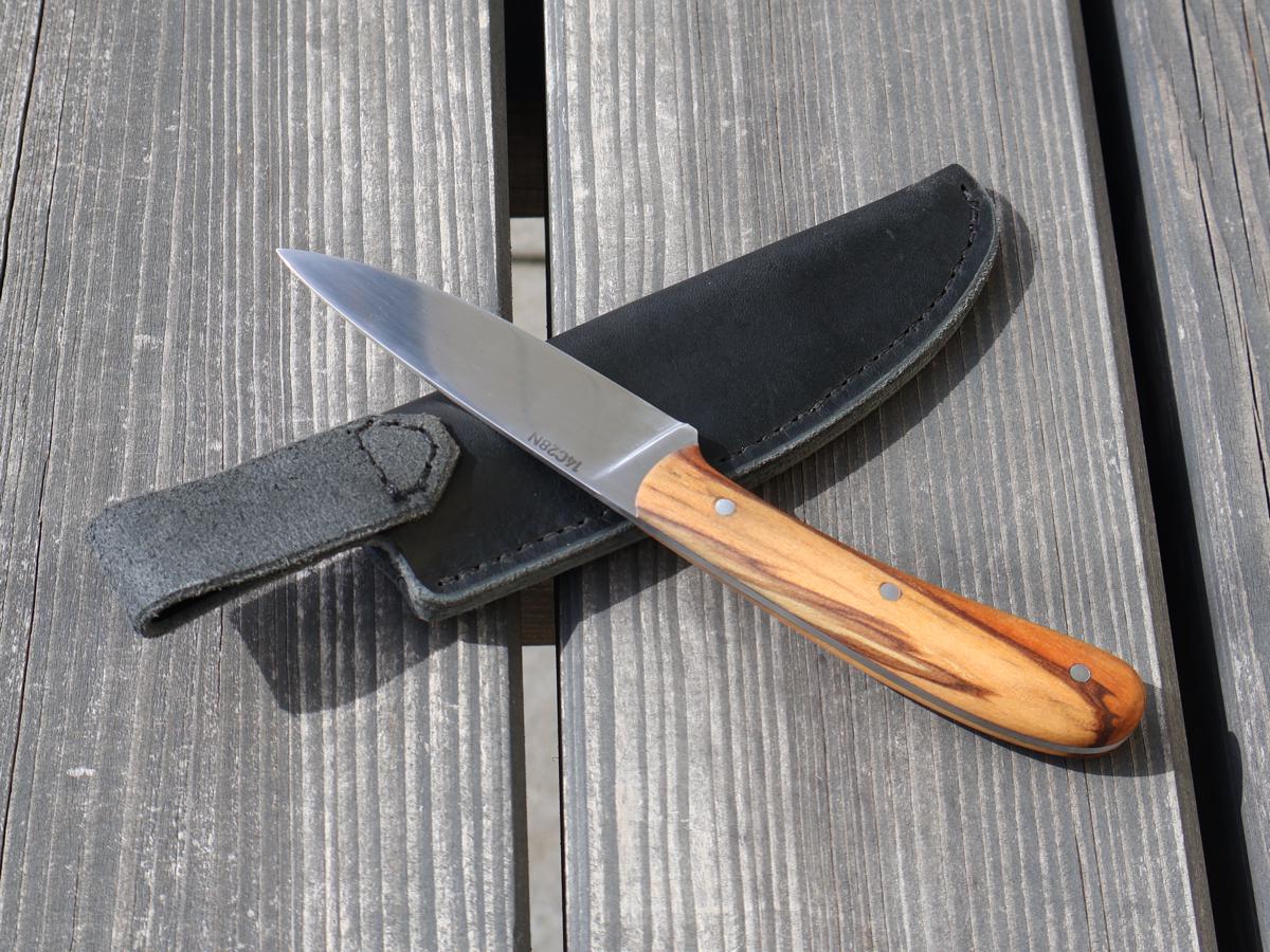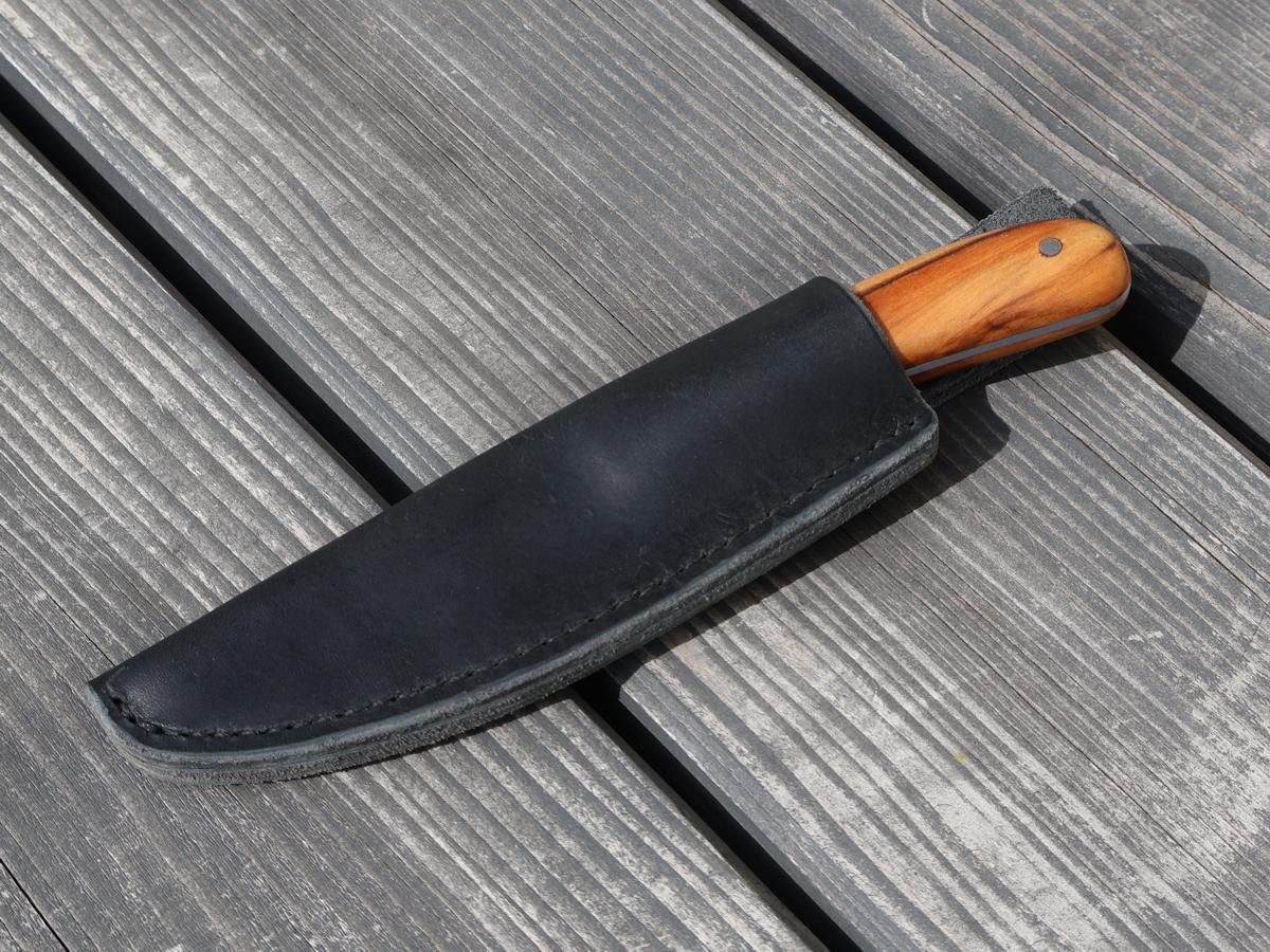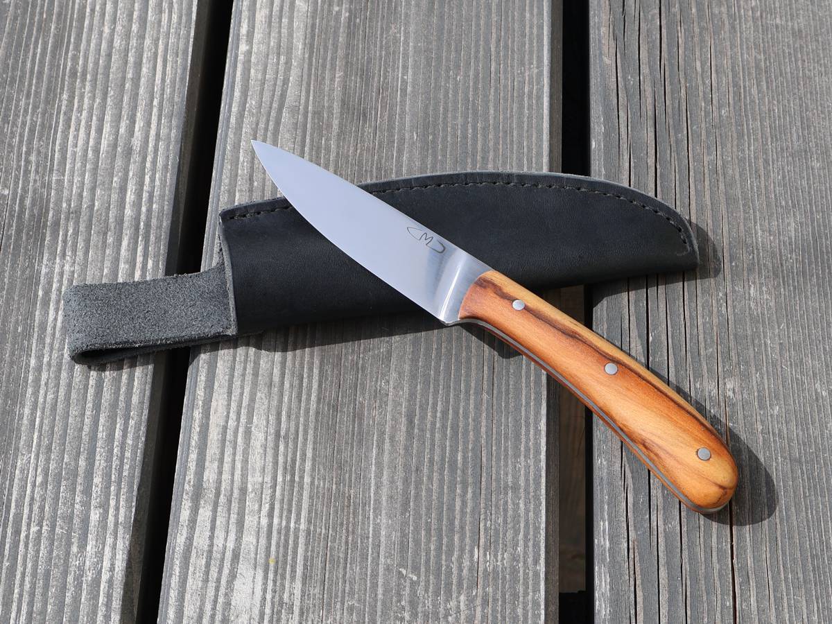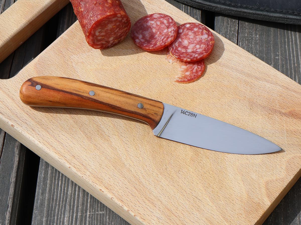 Dieses Messer kann man sehr schön mit auf eine Wanderung nehmen und sich eine Brotzeit damit zubereiten. Durch die dünn ausgeschliffene Klinge kann man damit sehr gut schneiden. Es funktioniert auch einen Stock damit zu schnitzen, jedoch sollte man das Messer nicht für grobe Hackarbeiten verwenden. Der Griff ist aus dem Holz „Red Gum“ und hat eine sehr schöne Maserung. Die Lederscheide ist für Leute gemacht, die ihr Messer auf der linken Seite tragen. Wenn man es nur in den Rucksack legen will, spielt die Grütelschlaufe natürlich keine Rolle.